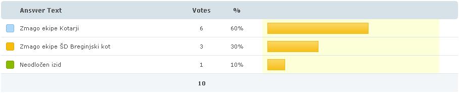 Spodaj si lahko ogledate rezultate ankete, ki je bila objavljena na spletni strani nekaj dni pred derbijem. Morda vprašanje ni bilo najbolj primerno glede na pričakovanja in realno stanje, ampak kljub temu so odgovori precej raznovrstni. 😉